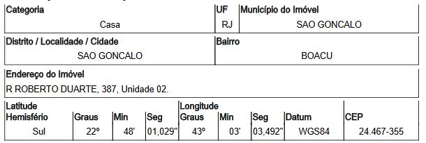 Localização: Casa em Endereço: AVENIDA ROBERTO DUARTE | Bairro: BOACU | Número: N. 387 CS 02 SAO GONCALO - RJ