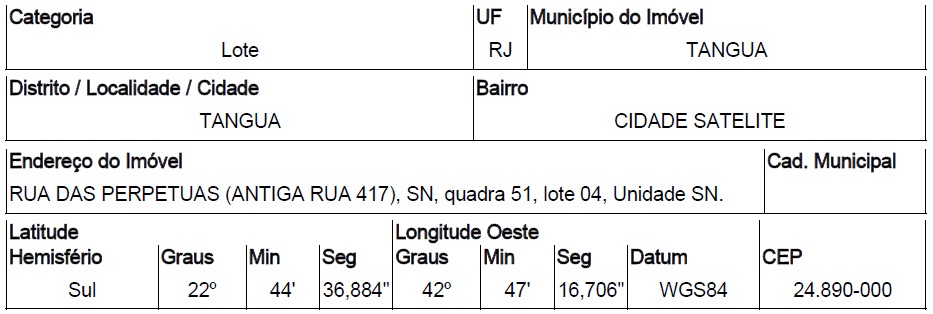 . RUA DAS PERPETUAS QD 51, LT 04, DUQUES - CEP: 24890-000, TANGUA - RIO DE JANEIRO