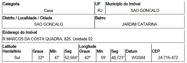 Localização: Casa em Endereço: RUA MARCOS DA COSTA | Bairro: JARDIM CATARINA | Número: N. 826 CS 02 SAO GONCALO - RJ